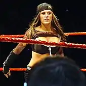 A week later on the August 22, 2005, episode of Raw, Candice Michelle and Torrie Wilson attacked Massaro after pretending to welcome her to the brand.[11] Massaro's storyline feud with Wilson and Michelle continued over the next couple weeks, as the duo, along with their enforcer Victoria (dubbed as the "Skankateers" by commentator Jim Ross), made things difficult for Massaro.[12] Massaro made her in-ring debut on the August 29 episode of Raw, in a losing effort to Victoria.[13] On the September 5 episode of Raw, Massaro was defeated by Wilson due to interference from Victoria and Candice.[1] Massaro evened the score on the September 12 episode of Raw when she brought out the returning Trish Stratus (who then turned face), and the duo proceeded to attack them.[14] On the September 18 episode of Raw, The pair defeated the trio—who became known as the Ladies in Pink (and later Vince's Devils).[1] This led to a tag team match at Unforgiven, where the team of Stratus and Massaro defeated Wilson and Victoria.[15] The following night on Raw, Massaro accompanied Trish where she defeated Wilson. After the match, The duo were attacked by The Vince Devils.[1] The feud continued into WWE Homecoming, where Stratus and Massaro defeated Wilson, Candice, and Victoria in the first ever three on two Bra and Panties match by stripping all three of their opponents.[16] Massaro continued to wrestle matches through the rest of 2005 and was involved in the annual Fulfill Your Fantasy Diva Battle Royal at Taboo Tuesday for her first shot at the WWE Women's Championship.[17] Massaro eliminated Candice Michelle before being eliminated by Victoria.[17]