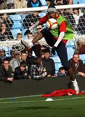 On 20 April 2008, Young scored two goals and assisted two goals for Aston Villa against Birmingham City at Villa Park and Villa went on to win the match 5–1.[19] He also scored the winner against Danish club Odense Boldklub in Villa's home leg of the UEFA Intertoto Cup third round. On 10 October 2008, Young won the Premier League Player of the Month award. This was due to his performances in the 2008–09 Premier League season. Having also won the award in April 2008, Young joins the list of players who have won the award more than once including Cristiano Ronaldo, Wayne Rooney and Steven Gerrard. On 7 December 2008, in the 3–2 win over Everton, Young scored two goals, one being an injury time winner after Everton's Joleon Lescott, a boyhood Villa fan, had equalised seconds earlier.[20] Manager Martin O'Neill later described the player as being 'world-class' in the post-match press conference. Young signed a new four-year contract until 2012 on 4 November 2008.[21] On 10 January 2009, Young was again awarded the Premier League Player of the Month award for December, along with O'Neill, who won the Manager of the Month award. He became the first ever player to win three Premier League Player of the Month awards in the same year.[22] During a match against Sunderland on 18 January 2009, Young was sent off for a two-footed foul on Sunderland's Dean Whitehead.[23] On 26 April 2009, he won the PFA Young Player of the Year award.[24]