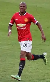 On 7 August 2015, Young signed a new three-year contract with Manchester United, keeping him at the club until June 2018, with the option to extend a further year.[43] Young's appearances at the beginning of the season were slim, with him making only one start in United's opening seven Premier League games, this being in the opening game on 8 August 2015, a 1–0 win against Tottenham Hotspur.[44] On 12 September, Young played through debutant Anthony Martial to score his first goal for United in a 3–1 victory against rivals Liverpool.[45] Young returned to the starting XI at left-back on 4 October against Arsenal, ending in a 3–0 away defeat.[46] He started at right-back against West Brom on 7 November, which ended in a 2–0 win for United; this was a position he frequently played during November, December and January due to injury to Antonio Valencia.[47] On 2 January 2016, Young assisted Anthony Martial with a cross into the box to open the scoring against Swansea City, with the game ending in a 2–1 win for United.[48] Young suffered a 'severe groin injury' against Liverpool on 17 January which led to him being sidelined for several months.[49] He made his return on 10 April against Tottenham Hotspur, replacing Marcus Rashford at half time, playing upfront in a 3–0 defeat.[50] The decision to play Young as a striker saw Van Gaal face heavy criticism, however the Dutchman defended his actions by explaining he "wanted more running in behind."[51][52] Young scored his only goal of the season on 17 May, the last day of the Premier League, in a 3–1 win against AFC Bournemouth after coming on as a substitute for Anthony Martial.[53] On 21 May, he won the FA Cup after defeating Crystal Palace 2–1 in the final after extra time, playing at both striker and left-back after replacing Marcus Rashford in the 72nd minute – marking his third domestic trophy with the club.[54]