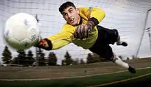 Goalkeeper is the most defensive position in football. The goalkeeper's main job is to stop the other team from scoring by catching, palming or punching the ball from shots, headers and crosses. Unlike their teammates, goalkeepers typically remain in and around their own penalty area for most of the game. As a result, goalkeepers have a better view of the pitch and often give advice to their defence when the other team is on the attack or during set pieces.[4] Goalkeepers are the only players on the pitch who are allowed to handle the ball, but this is restricted to their own penalty area. Positioning is another important job and is one of the hardest to master as keeper.[5]