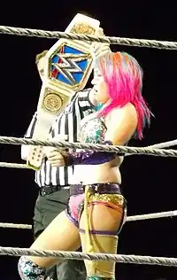 At SummerSlam, Asuka competed against both Bayley for the SmackDown Women's Championship, and later Banks for the Raw Women's Championship; she lost the first match, but later defeated Banks to win back the Raw Women's Championship, marking her first time winning any WWE title more than once.[325][326] At Clash of Champions, Asuka defeated Zelina Vega to retain her championship and, later in the night, answered Bayley's open challenge for the SmackDown Women's Championship, which she won via disqualification.[327] The following night on Raw, Asuka faced Zelina Vega for the Raw Women's Championship and again successfully retained.[328] On the October 5 episode of Raw, Asuka teamed with Dana Brooke and Mandy Rose to defeat Zelina Vega, Natalya, and Lana.[329] On the October 19 episode of Raw, Asuka successfully retained her title against Lana.[330] Asuka then faced Sasha Banks at Survivor Series in a losing effort.[331] At TLC: Tables, Ladders & Chairs, Asuka and Charlotte Flair defeat Jax and Baszler to win the tag team titles, making Asuka a double champion.[332] They lost the titles back to Jax and Baszler at the Royal Rumble.[333] She also lost the Raw Women's title at WrestleMania 37 against Rhea Ripley, ending her reign at 231 days.[334] On the Raw after WrestleMania, Asuka faced Ripley for the title in a rematch which resulted in a no-contest due to Charlotte Flair attacking both of them.[335] On the May 3 episode of Raw, another rematch between Ripley and Asuka for the Raw Women's Championship was scheduled for WrestleMania Backlash. However, later that night, WWE official Sonya Deville added Flair to the championship match to make it a triple threat match.[336] At the event, Asuka was unsuccessful to win the title and was pinned by Ripley.[337]