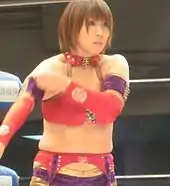 Kana made her debut for Yoshihiro Tajiri's new Smash promotion on June 25, 2010, losing to Syuri in the main event of Smash.4.[95] After the match, Kana left the arena smiling and later challenged Syuri to a rematch, which was made official on June 30.[96] In the rematch on July 24 at Smash.5 Kana, now a full blown heel, defeated Syuri via submission in just three minutes.[95] As part of the attempt to get her over as the top villain, Kana wrote a manifesto for the Weekly Pro-Wrestling magazine, which was published on August 4 and where she attacked the entire Joshi Puroresu community, claiming it was full of wrestlers with no personality and bad attitudes and who wrestled in an unrealistic manner.[97] The article led to a confrontation between Kana and wrestlers from the JWP Joshi Puroresu promotion on August 30 at Smash.7, but never led to a direct match.[98] Kana then began feuding with Tajiri, which led to an intergender match on December 24 at Happening Eve, where Tajiri was victorious.[99] Following the loss, Kana reemerged on January 29, 2011, as the leader of the Triple Tails stable with the Shirai sisters,[100][101] dubbing herself Sekai no Kana (literally "World Famous Kana").[102] Kana then continued working against the opposite sex, teaming with the Shirais to defeat Tajiri, Ken Ohka and Yoshiaki Yago on February 25,[103] but losing to Funaki on March 31.[104]