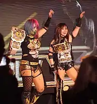 On the April 16, 2019, episode of SmackDown, Paige announced that she would be managing a newly formed women's tag team, consisting of Asuka and the debuting Kairi Sane from NXT.[297] The team of Asuka and Kairi Sane, later dubbed as "The Kabuki Warriors",[298][299][300] was immediately put in a feud with The IIconics (Billie Kay and Peyton Royce) over the WWE Women's Tag Team Championship. After weeks of avoiding them, The IIconics lost to The Kabuki Warriors during WWE's tour in Tokyo,[301] which earned The Kabuki Warriors a title match.[302] The title match took place on the July 16 episode of SmackDown, where The IIconics retained after they got themselves counted–out.[303] In August, The Kabuki Warriors failed to capture the titles from then–champions Alexa Bliss and Nikki Cross.[304][305]