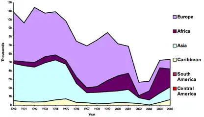 During the Cold War, and up until the mid-1990s, the majority of refugees resettled in the U.S. were people from the former-Soviet Union and Southeast Asia.[16] The most conspicuous of the latter were the refugees from Vietnam following the Vietnam War, sometimes known as "boat people". Following the end of the Cold War, the largest resettled European group were refugees from the Balkans, primarily Serbs, from Kosovo, Bosnia and Croatia.[16] In the 1990s and 2000s, the proportion of Africans rose in the annual resettled population, as many people fled various ongoing conflicts.[16]