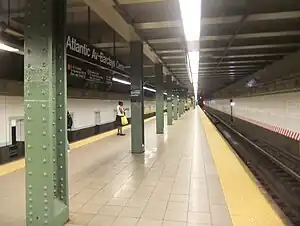 The MTA announced in late 1978 that it would modernize the Atlantic Avenue/Pacific Street station. The improvements included new finishes on the walls and floors; acoustical, signage, and lighting improvements; replacement of old mechanical equipment; and new handrails.[118] A further renovation of the Atlantic Avenue station was funded in 1983 as part of the MTA's capital plan.[119] The renovation was supposed to begin in 1983 but was postponed to 1989 due to various issues such as cost overruns.[120] The complex was planned to be renovated for $26.6 million, but MTA officials diverted funding for the project in December 1989 to cover a budget shortfall.[121][122] To discourage crime, the MTA also installed CCTV cameras at the Atlantic Avenue IRT station in 1989.[123]