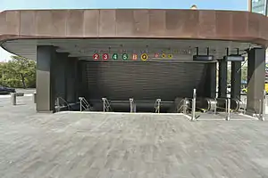 In June 2009, the MTA sold the naming rights of the station complex to Barclays, who had also bought the naming rights to the under-construction Barclays Center sports arena, for 20 years at $200,000 per year.[149][150] It was one of the few such renames in the system; following this renaming, the MTA considered selling the naming rights of other subway stations.[151][lower-alpha 1] A new entrance through the station, the Atlantic Terminal Pavilion, opened in 2010.[152] As part of a pilot program, digital announcement boards, train countdown clocks, and improved intercom systems were installed in the station the same year.[153] In advance of Barclays Center's opening, the station was renamed Atlantic Avenue–Barclays Center in May 2012.[154][155] A new entrance serving the arena, which includes stairs, escalators, and an elevator, opened in September 2012 at a cost of $76 million.[156][157] The new entrance, originally budgeted at $29 million, required digging a hole measuring 35 feet (11 m) deep and 100 by 125 feet (30 by 38 m) wide.[157]