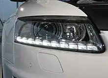 Visually, the RS 6 differed from the related S6, having flared front and rear wheel arches (fenders), harking back to the original Audi Quattro, to allow for a wider wheel track. It also had no front fog lights to allow for larger frontal air intakes (for the two side-mounted intercoolers (SMICs), and additional radiators). The ten (per side) front light-emitting diode (LED) daytime running lights (DRLs) are located within the main headlamp housing on the RS 6 in order to increase the size of the air intakes, whereas similar LEDs (but five per side) on the related S6 are found adjacent to the fog lamps in the lower front bumper. LED lighting technology was also used in the rear lights. The RS 6 also included adaptive headlights, which swivel around corners in conjunction with steering wheel movements. The facelifted Audi A6, released as a 2009 model, received similar front and rear-end LED lighting styling to that pioneered on the RS 6.