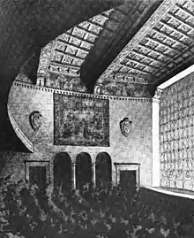 The main ceiling had large beams and smaller transverse beams made of metal, decorated to resemble heavy wooden beams.[27][34] The coffers between the beams were decorated in red, gold, green, and blue. Two metal chandeliers were hung from the ceiling; one critic described the chandeliers as containing "tulip shaped lights".[27] The ceiling over the balcony had a different design, partially overhanging the orchestra. The balcony ceiling was made of milky green plaster with gilded stars and was lit indirectly by golden glazed discs.[27] After the 1950s renovations, the ceiling decorations were totally removed and plain chandeliers were suspended there.[6][24] After 1995, the balcony ceiling was painted blue, and gilded stars and white glass globes were added.[6]