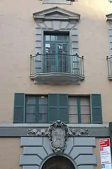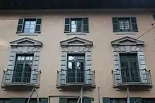Most of the second-story windows are casement windows flanked by shutters,[14] originally painted blue-green.[11] The exceptions are the westernmost two openings, which are slightly above the rest of the second story and do not contain shutters.[15] On the third story, the westernmost windows are also simple in design, and a sign hangs next to the westernmost window.[14] The center of the third story contains five French windows, each with a wrought-iron balcony in front of it. Each French window is surrounded by stone blocks and topped by a stone pediment.[14][15][17] To the east is an arcade with three arches and an iron railing,[14][15][19] which screen a fire-escape balcony.[14][16] On the fourth story are windows with shutters, extending the width of the theater.[14][15] Above the fourth story, brackets support a pitched tile roof that slightly overhangs the facade.[14][20] The stage house rises above the western part of the roof, with a facade of plain brick.[14][16] This was in keeping with many theaters of the time, which contained plain stage houses above their ornate primary facades,[16] but Architectural Record characterized the stage house as a missed opportunity for decoration.[21]