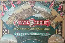 The following year, 1838, was the 50th anniversary of the founding of the colony, and as part of the celebrations Australia's first public holiday was declared. The regatta was held for a second time, and people crowded the foreshores to view the events, or joined the five steamers (Maitland, Experiment, Australia, Rapid, and the miniature steamer Firefly) to view the proceedings from the water. At midday 50 guns were fired from Dawes' Battery as the Royal Standard was raised, and in the evening rockets and other fireworks lit the sky.[33] The dinner was a smaller affair than the previous year, with only 40 in attendance compared to the 160 from 1837,[32][33] and the anniversary as a whole was described as a "day for everyone".[28]