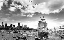 In 1988, the celebration of 200 years since the arrival of the First Fleet was organised on a large scale as the Australian Bicentenary, with many significant events taking place in all major cities.[25] Over 2.5 million people attended the event in Sydney.[28] These included street parties, concerts, including performances on the steps and forecourt of the Sydney Opera House and at many other public venues, art and literary competitions, historic re-enactments, and the opening of the Powerhouse Museum at its new location. A re-enactment of the arrival of the First Fleet took place in Sydney Harbour, with ships that had sailed from Portsmouth a year earlier taking part.[25][28]
