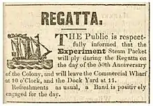 Foundation Day, as it was known at the time, continued to be officially celebrated in New South Wales, and in doing so became connected with sporting events.[28] One of these became a tradition that is still continued today: in 1837 the first running of what would become the Australia Day regatta was held on Sydney Harbour.[25][30] Five races were held for different classes of boats, from first class sailing vessels to watermen's skiffs, and people viewed the festivities from both onshore and from the decks of boats on the harbour, including the steamboat Australian and the Francis Freeling—the latter running aground during the festivities and having to be refloated the next day.[31] Happy with the success of the regatta, the organisers resolved to make it an annual event.[30] However, some of the celebrations had gained an air of elitism, with the "United Australians" dinner being limited to those born in Australia.[25] In describing the dinner, the Sydney Herald justified the decision, saying:
