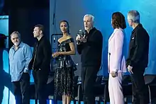 In 2012, Cameron said the sequels were being written as "separate stories that have an overall arc inclusive of the first film", with the second having a clear conclusion instead of a cliffhanger to the next film. Screenwriters were also announced: Josh Friedman for the first, Rick Jaffa and Amanda Silver for the second, and Shane Salerno for the third.[65] However, Friedman later clarified and said Jaffa and Silver were writing the first of the four sequels and he was writing the second.[78] In April 2014, Cameron expected to finish the (then) three scripts within six weeks, stating that all three sequels would be in production simultaneously and were still slated for December 2016 to 2018 releases.[79][80] He said although Friedman, Jaffa and Silver, and Salerno are each co-writing one sequel with him, they at first worked together on all three scripts: "I didn't assign each writer which film they were going to work on until the last day. I knew if I assigned them their scripts ahead of time, they'd tune out every time we were talking about the other movie."[65][81][82][18][78][83] Cameron added that they had "worked out every beat of the story across all three films so it all connects as one, sort of, three-film saga", a creative process that was inspired by his experiences in the writing room of his television series Dark Angel.[84] The writing took longer than expected, forcing Cameron to delay the release of the films further in 2015.[66]