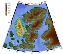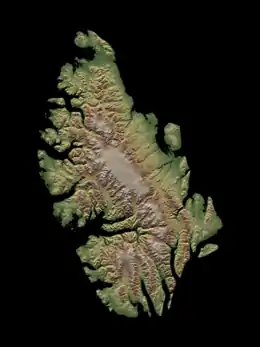 ![]() Shaded relief map of Axel Heiberg Island. Note that the colours are indicative of elevation, not foliage or ground cover | |