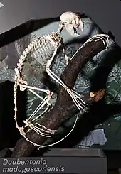 However, molecular results have consistently placed Daubentonia as the most basal of lemurs.[16][18][19][20][21][22][23][24] The most parsimonious explanation for this is that all lemurs are derived from a single ancestor that rafted from Africa to Madagascar during the Paleogene.[20][25][26] Similarities in dentition between aye-ayes and several African primate fossils (Plesiopithecus and Propotto) have led to the alternate theory that the ancestors of aye-ayes colonized Madagascar separately from other lemurs.[27] In 2008, Russell Mittermeier, Colin Groves, and others ignored addressing higher-level taxonomy by defining lemurs as monophyletic and containing five living families, including Daubentoniidae.[28]