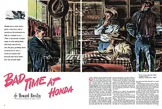Bad Day at Black Rock originated as a short story by Howard Breslin with full-color illustrations by Robert Fawcett.[12] Entitled "Bad Time at Honda", it was published by The American Magazine in January 1947.[13][14] It was adapted into a script by Don McGuire and pitched to MGM production head Dore Schary, who was known for championing films that addressed social problems. Schary had previously produced Go for Broke! (1951), based on the exploits of the segregated Japanese-American 442nd Regimental Combat Team.[14][15] Breslin novelised the script, using the pseudonym Michael Niall. His book was published in 1954 by Fawcett Publications.[16][17]