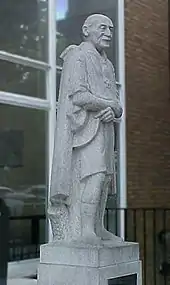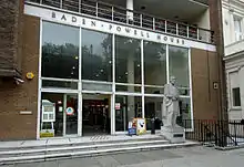A nearly three-metre high statue of Baden-Powell, at the time the only granite statue in London, sculpted by his personal friend Don Potter, was unveiled on 12 July 1961 by the Duke of Gloucester as part of the official opening.[4] It was located outside the main entrance to the building for the duration of its time owned by the Scout Association and was moved in August 2021 to Gilwell Park.