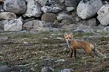 Baffin Island has both year-round and summer visitor wildlife. On land, examples of year-round wildlife are barren-ground caribou,[64] polar bear,[65] Arctic fox, red fox, Arctic hare, lemming, and Baffin Island wolf.[66]