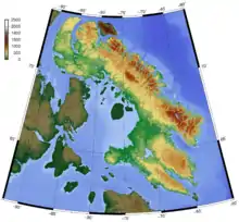 The Baffin Mountains run along the northeastern coast of the island and are a part of the Arctic Cordillera. The highest peak is Mount Odin, with an elevation of at least 2,143 m (7,031 ft), although some sources say 2,147 m (7,044 ft).[22][23] Another peak of note is Mount Asgard, located in Auyuittuq National Park, with an elevation of 2,011 m (6,598 ft). Mount Thor, with an elevation of 1,675 m (5,495 ft), is said to have the greatest purely vertical drop (a sheer cliff face) of any mountain on Earth, at 1,250 m (4,100 ft).[24] Mount Sharat,[25] with an elevation of 422 m (1,385 ft) and a prominence of 67 m (220 ft) is located on Baffin Island. The mountain is named after geologist Sharat Kumar Roy, the chief geology curator in the Field Museum of Natural History, Chicago. Roy, a native of India, studied in India, London, and earned his Ph.D. at the University of Chicago. Shortly after he started at the Field Museum he joined the 1927–1928 Rawson-Macmillan Expedition to Baffin Island and Labrador. This 15-month expedition began in June 1927.