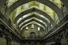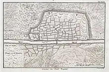 The basic framework of the city consists of two large semicircles about 19 km (12 mi) in diameter. The inner city connecting them was designed as a circle about 2 km (1.2 mi) in diameter, leading it to be known as the "Round City". The original design shows a single ring of residential and commercial structures along the inside of the city walls, but the final construction added another ring inside the first.[36] Within the city there were many parks, gardens, villas, and promenades.[37] There was a large sanitation department, many fountains and public baths, and unlike contemporary European cities at the time, streets were frequently washed free of debris and trash.[38] In fact, by the time of Harun al-Rashid, Baghdad had a few thousand hammams. These baths increased public hygiene and served as a way for the religious to perform ablutions as prescribed by Islam. Moreover, entry fees were usually so low that almost everyone could afford them.[39] In the center of the city lay the mosque, as well as headquarters for guards. The purpose or use of the remaining space in the center is unknown. The circular design of the city was a direct reflection of the traditional Persian Sasanian urban design. The Sasanian city of Gur in Fars, built 500 years before Baghdad, is nearly identical in its general circular design, radiating avenues, and the government buildings and temples at the center of the city. This style of urban planning contrasted with Ancient Greek and Roman urban planning, in which cities are designed as squares or rectangles with streets intersecting each other at right angles.
