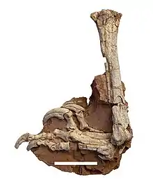 The first small bones belonging to Balaur bondoc consisted of six elements of the front limbs. Named specimens FGGUB R. 1580–1585, these were discovered in 1997 in Romania by Dan Grigorescu, but the morphology of the arm was so unusual that scientists could not correctly combine them,[6][7] mistaking them for the remains of an oviraptorosaur.[8] The first partial skeleton was discovered in September 2009 in Romania, approximately 2.5 kilometers north of Sebeș, along the Sebeș river in the Sebeș Formation dating from the early Maastrichtian, and was given the preliminary field number SbG/A-Sk1. Later it received the holotype inventory number EME VP.313. The discovery was made by the geologist and paleontologist Mátyás Vremir of the Transylvanian Museum Society of Cluj Napoca who sent them for analysis to Zoltán Csiki of the University of Bucharest.[9] The findings were described on August 31, 2010, in the Proceedings of the National Academy of Sciences.[10] The 1997 specimens indicate an individual about 45% longer than the holotype; they were also found in a younger stratum.