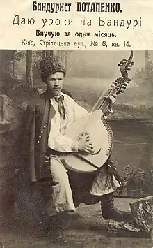Musicians who play the bandura are referred to as bandurists. In the 19th and early 20th centuries traditional bandura players, often blind, were called kobzars.[3] It is suggested that the instrument developed as a hybrid of gusli (Eastern-European psaltery) and kobza (Eastern-European lute). Some also consider the kobza as a type or an instrument resembling the bandura.[4] The term bandura occurs in Polish chronicles from 1441. The hybridization, however, occurred in the late-18th or early-19th centuries.