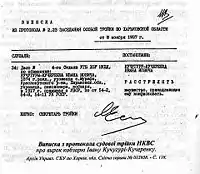 According to a widespread version, the musicians were gathered under the guise of an ethnographic conference and then mass-executed. Various versions give different times for the conference and location. The confusion is exacerbated by the fact that little differentiation is made between the kobzari, bandurists and lirnyky. Archival documents attesting to the organisation of such a conference have been found which were affirmed by bandurist Mykhailo Polotay who had been one of the instigators and organisers of the conference. Although no documents directly attesting to the mass-execution of the kobzari has been found to date, we do have a significant list of kobzari and bandurists who died or disappeared at this time.