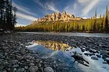 Many of the mountain ranges trend northwest to southeast, with sedimentary layering dipping down to the west at 40–60 degrees.[39] This leads to dip slope landforms, with generally steeper east and north faces, and trellis drainage, where rivers and old glacial valleys followed the weaker layers in the rocks as they were relatively easily weathered and eroded.[39][46] Classic examples are found at the Banff townsite proper: Mount Rundle is a classic dip slope mountain.[47]: 28 Just to the north of the Banff townsite, Castle Mountain is composed of numerous Cambrian age rock formations. The uppermost section of the peak consists of relatively harder dolomite from the Eldon Formation. Below that lies the less dense shales of the Stephen Formation and the lowest exposed cliffs are limestones of the Cathedral Formation.[48][47]: 76 Dogtooth mountains, such as Mount Louis, exhibit sharp, jagged slopes.[47]: 114 The Sawback Range, which consists of nearly vertical dipping sedimentary layers, has been eroded by cross gullies.[49] The erosion of these almost vertical layers of rock strata in the Sawback Range has resulted in formations that appear like the teeth on a saw blade.[50] Erosion and deposition of higher elevation rock layers has resulted in scree deposits at the lowest elevations of many of the mountains.