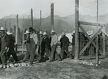 During World War I, immigrants from Austria-Hungary and Germany were sent to Banff to work in internment camps.[18] The main camp was located at Castle Mountain, and was moved to Cave and Basin during winter.[18] Much early infrastructure and road construction was done by men of various Slavic origins although Ukrainians constituted a majority of those held in Banff.[19] Historical plaques and a statue erected by the Ukrainian Canadian Civil Liberties Association commemorate those interned at Castle Mountain, and at Cave and Basin National Historic Site where an interpretive pavilion dealing with Canada's first national internment operations opened in September 2013.[20]