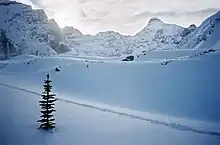 Under the Köppen climate classification, the park has a subarctic climate (Dfc) with cold, snowy winters, and mild summers.[57] The climate is influenced by altitude with lower temperatures generally found at higher elevations.[58] Located on the eastern side of the Continental Divide, Banff National Park receives 472 millimetres (18.6 in) of precipitation annually.[59] This is considerably less than in Yoho National Park on the western side of the divide in British Columbia, where 884 mm (34.8 in) is received at Wapta Lake and 616 mm (24.3 in) at Boulder Creek annually.[59] Being influenced by altitude, snowfall is also greater at higher elevations.[58] As such, 234 cm (92 in) of snow falls on average each year in the Banff townsite, while 304 cm (120 in) falls in Lake Louise, which is located at a higher altitude.[58]