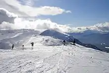 Winter tourism in Banff began in February 1917, with the first Banff Winter Carnival. It was marketed to a regional middle class audience, and became the centerpiece of local boosters aiming to attract visitors, which were a low priority for the Canadian Pacific Railway (CPR).[24] The carnival featured a large ice palace, which in 1917 was built by World War I internees. Carnival events included cross-country skiing, ski jumping, curling, snowshoe, and skijoring.[25] In the 1930s, the first downhill ski resort, Sunshine Village, was developed by the Brewsters. Mount Norquay ski area was also developed during the 1930s, with the first chair lift installed there in 1948.[12]
