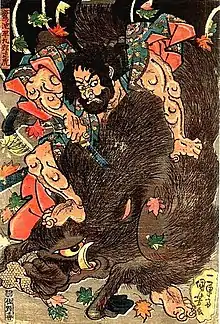 Representations of homosexuality in Japanese visual art have a history and context dating to the Muromachi period, as seen in Chigo no sōshi (稚児之草子, a collection of illustrations and stories on relationships between Buddhist monks and their adolescent male acolytes) and shunga (erotic woodblock prints originating in the Edo period).[9][13] While these works ostensibly depict male-male sexual relations, artist and historian Gengoroh Tagame questions whether the historic practices of sodomy and pederasty represented in these works can be considered analogous to modern conceptions of gay identity, and thus part of the artistic tradition to which contemporary gay erotic Japanese art belongs.[13] Tagame instead considers musha-e (warrior's pictures) to be a more direct forerunner to art styles common in gay manga: in contrast to pederastic shunga, both gay manga and musha-e portray masculine men with developed muscles and thick body hair, often in cruel or violent scenarios.[14]