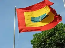 In 1811, the patriots who obtained the Independence of the Cartagenas adopted the current flag. It consists of three rectangles, red being the outermost, then yellow, and green in the center. Red symbolizes the blood of patriots; yellow, the sun of freedom and hope; and green, a proud home. In the centre, there is an eight-pointed silver star which symbolizes the eight provinces of the confederacy. The flag was carried by Simon Bolívar during the campaign of Lower Magdalena in 1812. In 1814, the Congress of Tunja adopted it as the emblem of the United Provinces of New Granada. In 1910, the Council approved the flag for Barranquilla.[19][20]