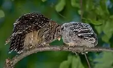 The female tends to closely brood the young for three weeks. Then after, she begins to hunt for the young. Both parents normally continue hunt for the young until they are about 6 weeks old and can fly well.[26] During the first three weeks, the male does all prey deliveries, either bringing prey directly into the nest or leaves for the female at the nest entrance or on a nearby branch. The mean number of prey deliveries when the young are 6–10 days old is 2.4 per night, 1.4 when they are 11–15 days old, 3.6 when they are 16–20 days old and 2.2 when they are 21–25 days old. He will continue hunting until the young disperse.[7][127][217] The female's prey deliveries are much more frequent when she resumes hunting, ranging from a mean of 4.8 to 8 deliveries nightly.[7][127] Male prey deliveries are often sporadically at any point through the night while female deliveries tend to be clustered immediately after sunset or just before sunrise.[127] Barred owls have a variable reaction to human disturbance. Some parent owls remain sitting, while some leave the nest upon a person's approach and some attack people climbing to the nest, as well as those approaching young on or near the ground.[42][54][224] There are several accounts of barred owls engaging in fierce nest defense against humans, sometimes reportedly knocking people out of trees.[9][42][224] However, their aggression is variable and, based on studies of similar owls like tawny and Ural owls from Europe, attacks tend to only occur when intrusions and disturbance by humans are frequent. A distraction display was recorded by a female barred owl when humans approached. In it, she spread and quivered her wings and engaged in chittering and squealing, somewhat similar to the sounds made by begging young.[225]