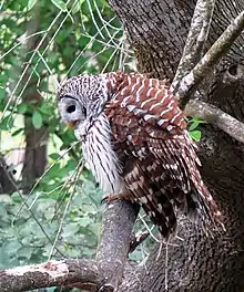 Barred owls are not confined to extensive forest, also dwelling extensively in semi-open wooded areas, locally in large parks with mature trees, and in forest adjacent regions recently logged.[4] Recent studies show suburban neighborhoods can be ideal habitat for barred owls, and the species may be considered a local synanthrope.[92] Using transmitters, scientists found that some regional populations, such as in Charlotte, North Carolina, increased faster in the suburban settings than in old growth forest. A factor of this suburban success may be easily accessible rodent prey in such settings. However, for breeding and roosting needs, this species needs at least some large trees and can be locally absent in some urban areas for this reason. The increased offspring offset the death rate due to impacts from cars, other types of collisions and disease.[93] Similarly, in Piedmont, South Carolina, productivity of the owls was higher in suburban areas and they comprised 41% of the territories of the local owls but various sorts of anthropogenic mortality were seemingly higher.[94] In suburban areas of Ohio, 41.4% of barred owl range was forested, 29.8% was low-density residential areas and less than 15% was pasture.[95] On the other hand, studies from the Northeastern United States, such as in New Jersey, found barred owls breeding mainly in plots of old-growth woodlands, and rarely successfully breeding in peri-urban areas, in part because of competitive and predatory displacement by great horned owls.[85][96] Furthermore, a study in North Carolina showed most barred owls appear to favor areas with at least 86 to 370 ha (210 to 910 acres) of woods but did not seem to be affected by the presence of roadways.[97]