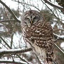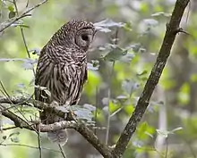 The habitat used by barred owl is largely old deciduous, mixed forests and, occasionally, coniferous forests.[4] Old growth forests are preferred due to more extensive potential nest sites, less lower-branch density to impede hunting (and perhaps superior structural complexity to aid hunting), greater security from mobbing and perhaps greater thermoregulation.[82][83] They are often found in bottomland hardwood forests in the largest swath of the native breeding range, often (particularly from Virginia south and west) with deep, dark stands of oak, gum and cypress.[9][84] Secondary habitat, often used during foraging forays in the south, are often oak savanna or cabbage-palm areas.[9] Regardless of area, some variety of water is frequently present, including riparian areas or swampy ground.[4][42][85] Closed canopy forests were preferred in a study from Oklahoma (62.8% of habitat used), followed by fallow agricultural fields (10.6%), wetlands (8.1%) and open terrain (6.2%). The latter three were visited during hunting forays, and wetlands and open terrain areas were not used outside of the breeding season.[86] Along the Atlantic coast area from New England to New Jersey, barred owls are often found in mixed swamps areas with cedars, seldom wandering to adjacent wetlands or farmland.[87][88] The species may be at home in wooded areas in mountainous regions.[4] More upland wooded habitats, often in mixed woods containing hemlock, alder, poplar, pine and oak, are typical in the northern part of the range.[26][85] A study in northern New Jersey found at least 15 species of both conifer and deciduous trees were routinely used for differing purposes.[89] In Michigan, barred owl habitat usually consists largely of some combination of hemlock and maple trees, with mixed forest usage being use disproportionately to its prevalence in the environment.[90] Large oak stands were preferred in Minnesota, a bit ahead of mixed forest and far ahead of white cedar swamps and other habitat types, which were either too dense, too open or had too few attractive nesting sites.[82][91]