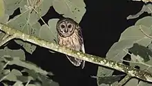 The barred owl, like most owls, is largely adapted to nocturnality.[4] Between 5:00 am and 8:00 pm, juvenile barred owls were recorded to sleep an average of 28% of each hour.[105] Peak times in Minnesota were found to be right after sunset and just before dawn.[106] Nonetheless, they are not as fully nocturnal as many owls and rank around 6th amongst 19 regular North American owl species for the regularity of their activity outside of nightfall, especially in particular circumstances such as when a rival or a human impersonator is emitting barred owls calls or whilst hunting. Often daytime activity tends to be early in the morning or around dusk but potentially at any time (overcast days being preferred).[107][108][109] This species often spends the daytime hidden away in the dense foliage of a tree, often at minimum 5 m (16 ft) above the ground, but sometimes also roosts in a branch close to a broad trunk or in a natural tree hollow.[4][9] Roost tree heights in Minnesota was typically 8 to 12 m (26 to 39 ft) while, in Illinois, they were up to 9 m (30 ft).[110][111] Recently fledged owls sometimes roost in tall grass, usually after falling from the nest tree.[54]