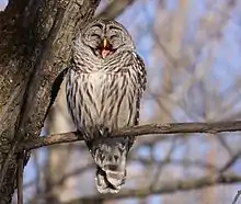 Another call type is the "mumble", a grumbling, slurred and subtle err-ERR-err, also an up-and-down "twitter" call at a high pitch.[44] When agitated, this species will make a buzzy, rasping hiss about three times in three seconds, repeating every 10–30 seconds, and will click its beak together forcefully.[42] Females and juveniles beg with high scratching skreeechch notes.[4] The voice of the two sexes is similar, but the female has a higher-pitched voice with longer terminal notes.[47][51] Of calls, 87 to 94% are identifiable to sex per one study.[44] While calls are most common at night, the birds do call during the day as well, especially when provoked by human playback or imitation.[52] They are more responsive than any hawk in the east to playback of calls of their own species.[53] The barred owl is noisy in most seasons but peak vocalization times for barred owls tend to be between late January (in Florida) and early April (in Canada).[47][54][55] Two seasonal peaks in vocalizations, one right before breeding and another after the young have dispersed, was detected in Connecticut, with peak vocalizations on nights with extensive cloud cover.[56] Peak times for vocalizations are between 6:00 pm and 6:00 am, with the least frequent vocalizations around mid-afternoon.[47]