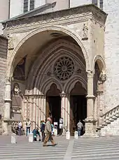 The doors are surmounted by a large rose window, flanked by two smaller ones, called "the eye of the most beautiful church in the world" [7] The decorations on the left wooden door were executed by Ugolinuccio da Gubbio (c.1550) and those on the right door by an anonymous Umbrian artist (1573). They portray stories from the lives of Saint Francis, Saint Clare, Saint Louis and Saint Anthony. On the left wall of the porch stands the bust of Pope Benedict XIV who granted this church the title of Patriarchal Basilica and Cappella Papale. Pope Benedict XVI's theological act in 2006 of renouncing the title of "Patriarch of the West" has had the consequence of the basilica changing its name to that of the Papal Basilica of St. Francis.