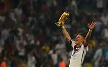 After making a substitute appearance in the team's second match against Ghana, Schweinsteiger was selected to start in the third group game against the United States.[62] He retained his place in the team for Germany's round of 16 match, a 2–1 win against Algeria. He was instrumental in the World Cup finals against Argentina and led the mid-field with sweeping passes for the German attack. Germany won the World Cup final 1–0 through Mario Götze's 113th-minute goal.[63]
