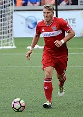 On 21 March 2017, Manchester United allowed Schweinsteiger to join Major League Soccer side Chicago Fire, subject to a medical and a visa being secured.[39][40][41] The move was completed on 29 March.[42] A few days later, Mourinho stated that he "regretted" the way he had treated Schweinsteiger.[43] On 1 April, Schweinsteiger debuted for Chicago Fire, scoring in a 2–2 home draw against Montreal Impact.[44] By mid-season, he would help guide Chicago to the top of the MLS standings and be voted into the "MLS All-Star Fan XI" (along with teammate Nemanja Nikolić) to face Real Madrid at the 2017 MLS All-Star Game in Chicago.[45] After guiding the Fire back into the playoffs after a five-year drought, Schweinsteiger was awarded the contract option of another year in 2018.[46] Schweinsteiger netted a goal and also provided an assist to Alan Gordon's equalising goal in the stoppage time in a 2–2 draw against Toronto FC on 29 April 2018.[47] On 5 August, he scored a long-range goal to level the scoreline after coming on as a substitute in the second half, but his side were defeated in a 2–1 away loss against Real Salt Lake.[48][49] On 11 July, Schweinsteiger scored a goal in the stoppage time and provided one assist to Aleksandar Katai's goal in a 4–3 home defeat against Philadelphia Union.[50]