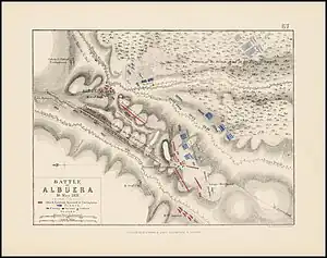 Also on the 13th, Beresford moved the British 2nd Division, Major General John Hamilton's Portuguese division and three artillery batteries from Badajoz to Valverde—an ideal position to observe the three routes open for Soult's approach. Wellington's orders left Beresford full discretion to fight Soult or to retreat and he was personally inclined to the latter course of action. However, when Beresford met with Blake and Castaños, the two most senior Spanish generals, at Valverde on 14 May, he allowed himself to be persuaded that the numerical superiority the Allied army had over Soult justified risking a battle.[47] The Allied leaders consequently agreed to concentrate at Albuera, which was the location chosen by Wellington as best suited for an attempt to resist any French advance to relieve Badajoz.[48]