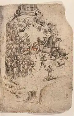 ![]() This depiction from the Scotichronicon (c. 1440) is the earliest known image of the battle. King Robert wielding an axe and Edward II fleeing toward Stirling feature prominently, conflating incidents from the two days of battle. Corpus Christi College, Cambridge. | |||||||