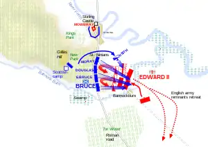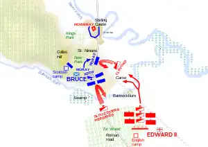 On the morning of 23 June 1314 it was still not certain if a battle was going to take place. The armies were still eight miles apart, giving King Robert the Bruce enough time to decide whether to move northwards beyond the Forth or westwards up the river into a district of mosses and hills.[16] Robert knew that the latter decision would influence the plans of Edward II and his lords. Given the declared objective and the advancing march the previous week, it was obvious that the English would continue their advance on Stirling.[16] In an effort to "rescue" Stirling, Edward II continued to hurry his troops: they marched seventy miles in one week. Many historians criticise Edward II for this move, as he was not acting as a leader of a well-trained army but was instead acting like a pilgrim. This bad decision making by Edward II led to horses, horsemen, and infantry becoming extremely worn out with toil and hunger.[16]