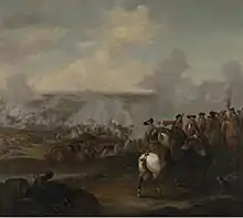 Marlborough now requested Prince Eugene to release Count Hendrick Fugger and his Imperial Cuirassier brigade to help repel the French cavalry thrust. Despite his own difficulties, Prince Eugene at once complied.[83] Although the Nebel stream lay between Fugger's and Marsin's squadrons, the French were forced to change front to meet this new threat, thus preventing Marsin from striking at Marlborough's infantry.[84] Fugger's cuirassiers charged and, striking at a favourable angle, threw back Marsin's squadrons in disorder.[85] With support from Blood's batteries, the Hessian, Hanoverian and Dutch infantry – now commanded by Count Berensdorf – succeeded in pushing the French and Irish infantry back into Oberglauheim so that they could not again threaten Churchill's flank as he moved against Tallard. The French commander in the village, de Blainville, was numbered among the heavy casualties.[53]