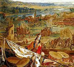 The majority of Tallard's retreating troops headed for Höchstädt but most did not make the safety of the town, plunging instead into the Danube where over 3,000 French horsemen drowned;[lower-alpha 17] others were cut down by the pursuing Allied cavalry. The Marquis de Gruignan attempted a counter-attack, but he was brushed aside by the triumphant Allies. After a final rally behind his camp's tents, shouting entreaties to stand and fight, Tallard was caught up in the rout and swept towards Sonderheim.[89] Surrounded by a squadron of Hessian troops, Tallard surrendered to Lieutenant Colonel de Boinenburg, the Prince of Hesse-Kassel's aide-de-camp, and was sent under escort to Marlborough.[90] Marlborough welcomed the French commander – "I am very sorry that such a cruel misfortune should have fallen upon a soldier for whom I have the highest regard."[89]