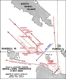 The Battle of Cape Esperance, also known as the Second Battle of Savo Island and in Japanese sources as the Sea Battle of Savo Island (サボ島沖海戦), took place on 11–12 October 1942, in the Pacific campaign of World War II between the Imperial Japanese Navy and United States Navy. The naval battle was the second of four major surface engagements during the Guadalcanal campaign and took place at the entrance to the strait between Savo Island and Guadalcanal in the Solomon Islands. Cape Esperance (9°15′S 159°42′E) is the northernmost point on Guadalcanal, and the battle took its name from this point.