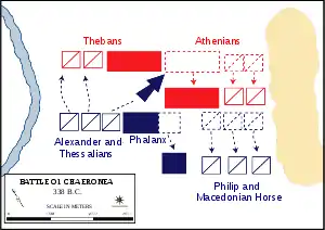 The allied army included contingents from Achaea, Corinth, Chalcis, Epidaurus, Megara, and Troezen, with the majority of troops being supplied by Athens and Thebes. The Athenian contingent was led by the generals Chares and Lysicles, and the Thebans by Theagenes. No source provides exact numbers for the allied army, although Justin suggests that the southern Greeks were "far superior in number of soldiers".[35] The modern view is that the numbers of the city states that fought were approximately equal to those of the Macedonians.[33]