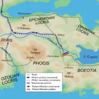 At the start of 339 BC, the Thebans had seized the town of Nicaea near Thermopylae, which Philip had garrisoned in 346 BC.[29] Philip does not appear to have treated this as a declaration of war, but it nevertheless presented him with a significant problem, blocking the main route.[29] However, a second route into central Greece was available, leading over the shoulder of Mount Callidromos and descending into Phocis.[29] However, the Athenians and Thebans had either forgotten the existence of this road, or believed that Philip would not use it; the subsequent failure to guard this road allowed Philip to slip into central Greece unhindered.[30]