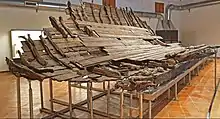 Vessels were built as cataphract, or "protected", ships – that is, fully decked over – so as to be better able to carry marines and catapults.[29][30] They had a separate "oar box" attached to the main hull which contained the rowers. These features allowed the hull to be strengthened, increased carrying capacity and improved conditions for the rowers.[31] The generally accepted theory regarding the arrangement of oarsmen in quinqueremes is that there would be sets – or files – of three oars, one above the other, with two oarsmen on each of the two uppermost oars and one on the lower, for a total of five oarsmen per file. This would be repeated down the side of a galley for a total of 28 files on each side; 168 oars in total.[32]